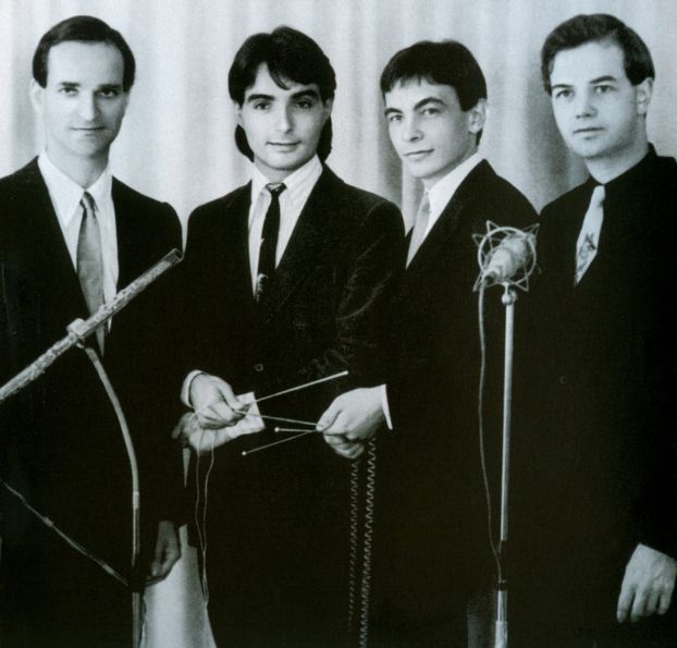 OHM SWEET OHM prints - $5 Two color screen print in 3 colorways based on the final cut on Kraftwerk's 1975 LP Radio-Activity; background image of the group from the reissue liner notes. |